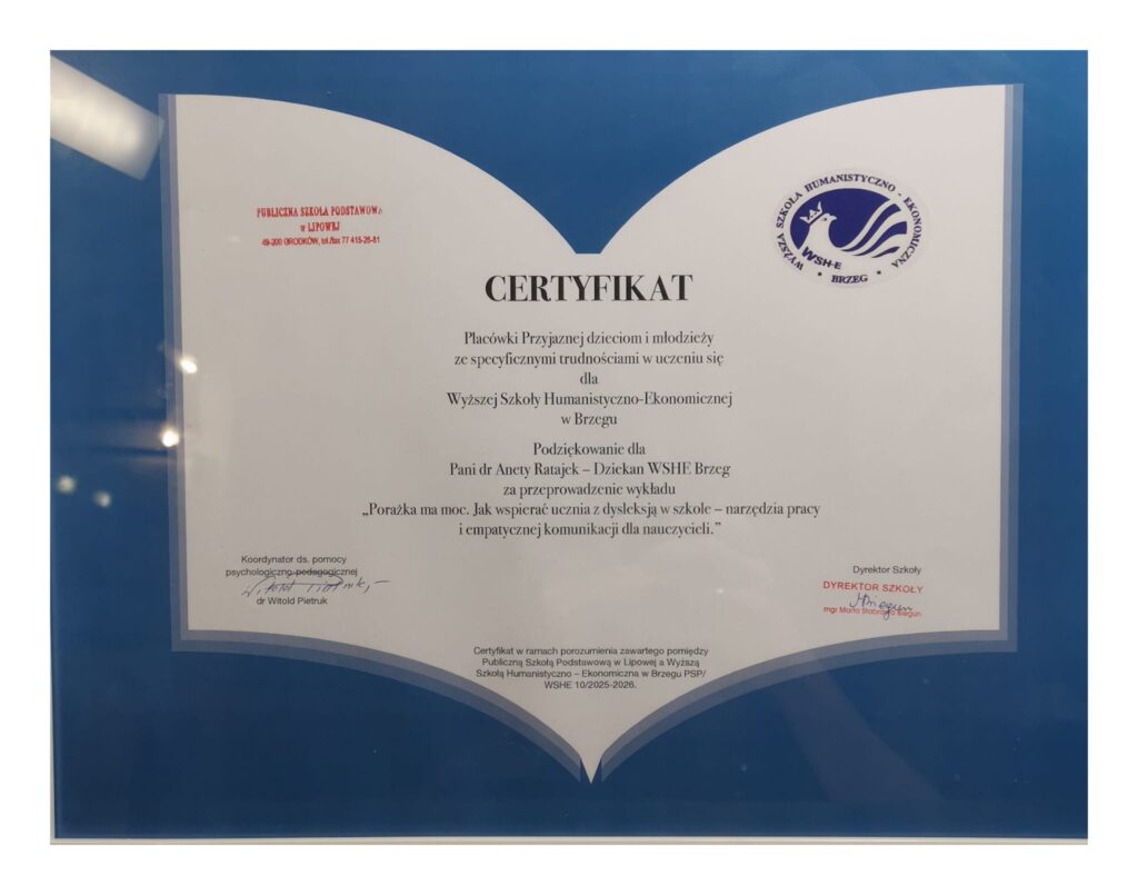 Z inicjatywy Publicznej Szkoły Podstawowej w Lipowej Wyższa Szkoła Humanistyczno-Ekonomiczna w Brzegu została również uhonorowana Certyfikatem „Placówki Przyjaznej dzieciom i młodzieży ze specyficznymi trudnościami w uczeniu się”. To dla nas szczególne wyróżnienie i wyraz uznania dla podejmowanych działań na rzecz wspierania uczniów oraz budowania empatycznej, włączającej przestrzeni edukacyjnej.😊🥰