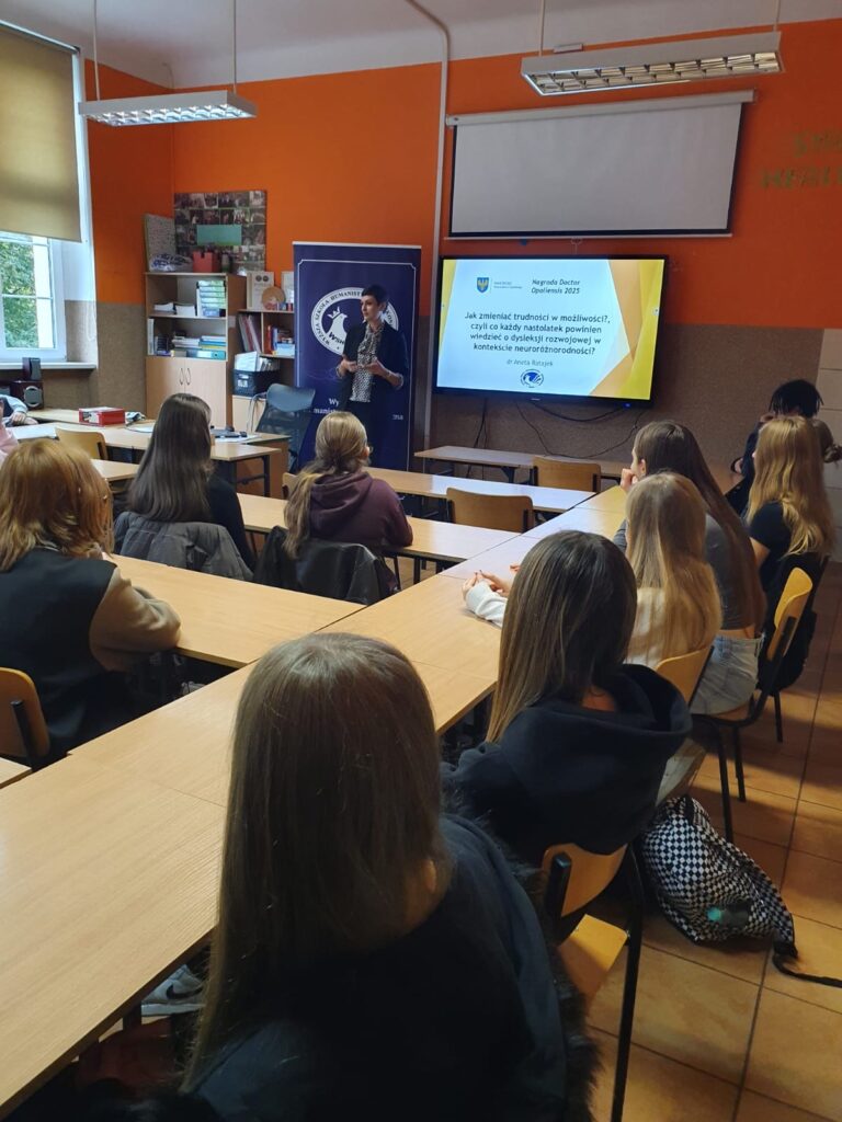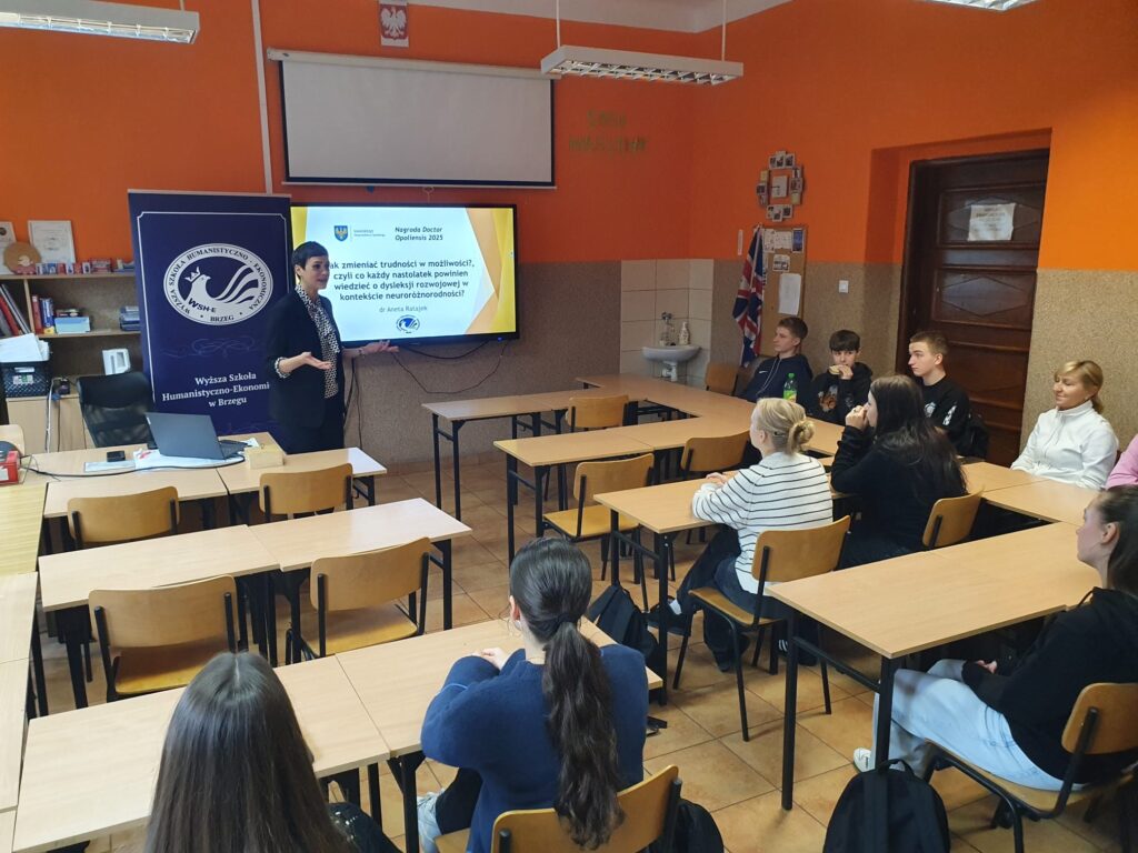 Dziekan WSHE w Brzegu dr Aneta Ratajek, laureatka Nagrody Marszałka Województwa Opolskiego Doctor Opoliensis 2025, poprowadziła w I Liceum Ogólnokształcącym im. Bolesława Chrobrego w Brzegu zajęcia dla młodzieży pt.: